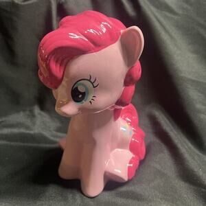 The product is a 2014 FAB Starpoint My Little Pony Pinkie Pie ceramic piggy coin bank figurine, standing at 9.5 inches tall. It features Pinkie Pie, a character from the My Little Pony franchise, in a pink color scheme. This collectible item is a decorative and functional piece for their collection. It has a small chip on the back foot. See pic for detail. The plug is also missing off the bottom. I was going to replace it but the one I had was too big.