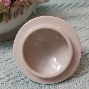 Elegant China sugar bowl with floral design. Features pink roses and green leaves. Gold trim adds a touch of luxury. Perfect for tea time.