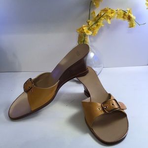 Beautiful Yellow Mustard leather COACH sandals size 10 gently worn with 3 inch heels. A few scuff marks and dark stain on button of the flap on right shoe, though not noticeable when flap is down. Please see pics, still has a lot of life in them. Gold color buckle, wooden platform sandals made in Italy. Does not come with the original box.