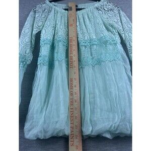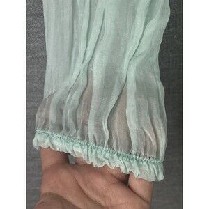 Elevate your wardrobe with this stunning mint green silk blend long sleeve top from Lola. The round neckline and raglan sleeves add a touch of elegance to the blouse, while the different lace fabrics and accents give it a unique and feminine touch. Bubble hem at the bottom to give the blouse more movement. Perfect for any occasion, whether it be travel, party, or casual, this lightweight and sheer sleeved top is sure to make a statement, it is lined throughout the body of the blouse for modesty. Made in Italy, this blouse is a size S / M and fits a regular size type. The garment care instructions recommend hand wash only. The blouse is lined and has a pullover closure. With its floral pattern and beautiful design, this top is a must-have for any fashion-forward woman's wardrobe.