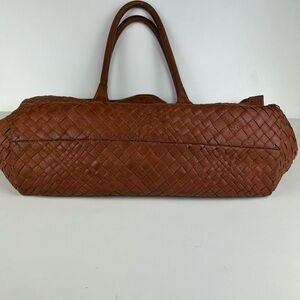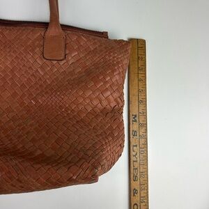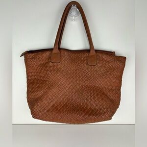 FALOR Firenze leather tote purse in a beautiful brown color. Gorgeous handwoven basket weave pattern. Interior has fabric lining with one zipper pocket inside. Top zip close.Amazing craftsmanship quality.