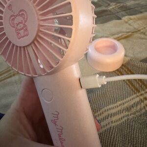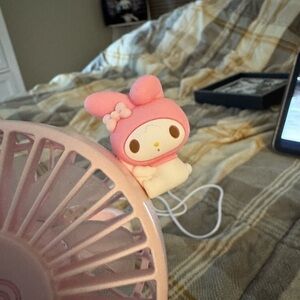 Cute pink handheld fan featuring My Melody design. Perfect for on-the-go cooling.