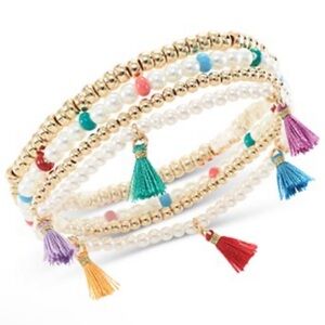 Add a pop of color to your outfit with this vibrant beaded bracelet set. Featuring gold and pearl beads with colorful tassels, it's perfect for any occasion. New with tag