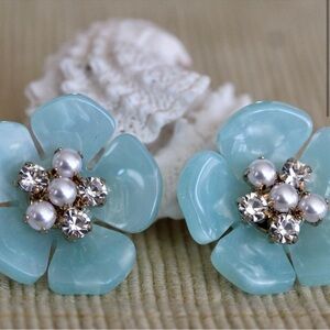 These elegant floral earrings feature a stunning blue hue, perfect for adding a touch of sophistication to any outfit. The intricate design is complemented by sparkling accents, making them a must-have accessory. New with tag