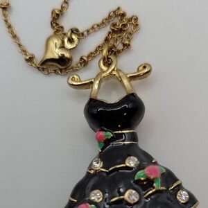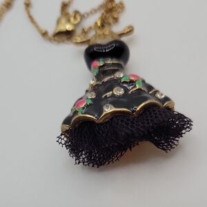 This exquisite Betsey Johnson necklace showcases a charming black dress pendant with intricate gold detailing, suspended from a gold-tone chain. The design is completed with a delicate lace trim and a small gold heart charm, offering a touch of vintage elegance.