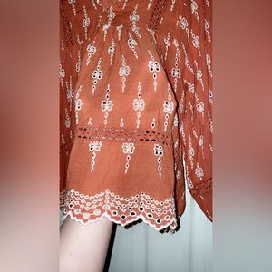 American Eagle bohemian style shirt. Eyelet is white, slightly sheer, rust-colored material. 100% cotton. Excellent pre-owned condition.