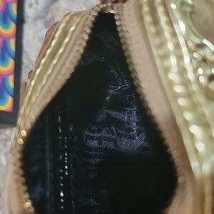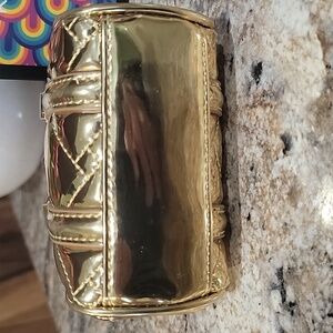 This Kensington Boston charm is a micro purse crafted in a metallic gold patent leather alternative. There is signature overstitch quilting across the exterior and two top handles. The front features a gold eagle head.