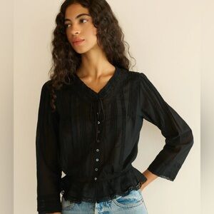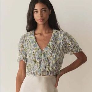 This elegant blouse from Doen features a charming smocked bodice and puff sleeves, offering a romantic and vintage-inspired look. The white and blue color palette adds a fresh touch, while the lightweight fabric ensures comfort and style. Perfect for adding a touch of sophistication to any outfit.