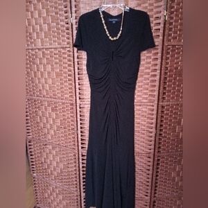 An elegant black midi-dress designed by Colleen Lopez/HSN. The dress features ruching in front and back, flutter cap-sleeves, keyhole front, and fishtail hemline.