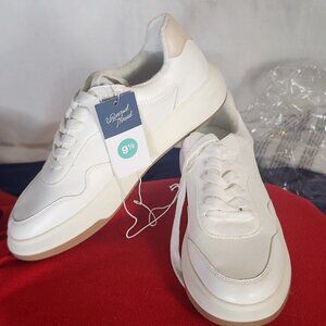 Universal Thread Goods Co. White Leather Flocked Lace Up Flora Athletic Shoes Size 9.5...Great Looking Athletic Shoe with a Pale Pink Heel in a Crisp Bright White....Great Shoe for Everyday or for Just Running Around.....Brand New with Tags.....