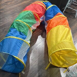 2 tunnels sold together. Engage your child with this vibrant learning tunnel. Featuring bright colors like blue, yellow, green, red, and orange, it's perfect for imaginative play. Encourage active fun and creativity with this exciting toy.