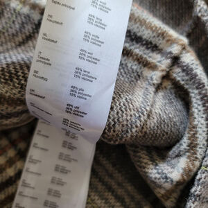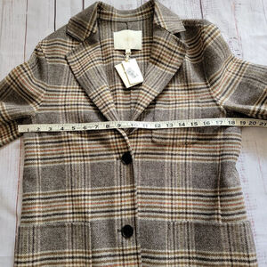 Maje Garion Wool Blazer. Plaid design in tan, brown, mustard and hint of orange. Two Button closure and collared. Wool blend. Women's 36, chest measures abou t 19" and length about 29". Their size chart lists a 36 as a US Small. NWT original retail $525.