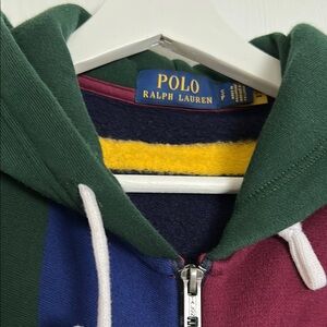 Vibrant hoodie with bold stripes. Features a mix of colors and a front zipper. Embroidered logo on chest.