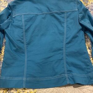 Discover the timeless appeal of the Jones New York Blue Jean Jacket with pockets. Crafted in a vibrant blue hue, this jacket features a classic cut with structured vertical seaming, offering a stylish and versatile addition to your outerwear collection. Measurements taken from side seam to side seam 18 across and length 22" In great condition.