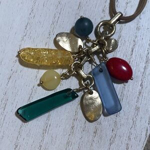 Vintage Chico’s necklace, gold hardware, multi-color beads, on a leather “chain”. Excellent condition! Leather is 31”, beads hang 4” and extender is 4.25”. Very nice and goes with many style outfits!