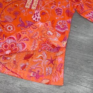 This Gretchen Scott tunic dress is perfect for any occasion, from casual outings to weddings and parties. The dress features a beautiful ocean-inspired pattern with a mix of colorful and bohemian accents. It has a V-neckline and 3/4 sleeves, with a collarless design and a pullover closure for easy wear.