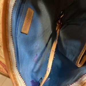 Measures 10 1/2 x six. Beautiful bag super cute, lightweight. Has the cute little heart Dooney tag on the front, she has some ink on the inside see pictures. Exterior is in good shape. See pictures.