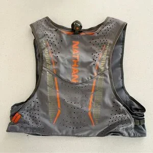 Nathan VaporKrar running vest, size M. Well loved and shows some wear and tear but is still fully functional. Fits me (34” chest) with the adjustable chest straps fully cinched. Chest strap expands to 40 inches.