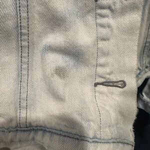 This jean jacket features a timeless trucker style with a cropped cut and a distressed light blue denim finish. Its classic design makes it a versatile addition to any casual wardrobe, offering a vintage-inspired look with modern appeal. Note : fraying at neck and two spots , see pictures