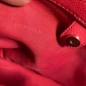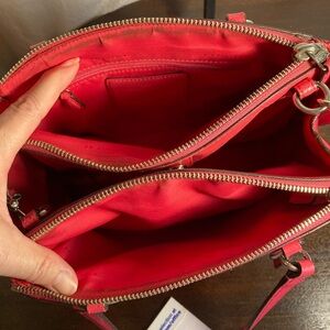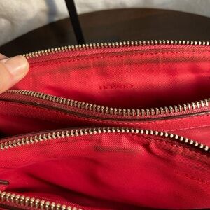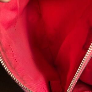 So pretty! 3 separate compartments, is preloved and does have some staining on inside see pics. This is a used bag! It is perfect for any occasion. Everything functional. 10x8 exterior is in good shape see pics