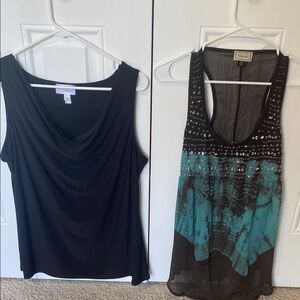 Elegant black drape neck sleeveless top perfect for any occasion. Comfortable and stylish, ideal for pairing with your favorite bottoms. Brown racerback tank with sequins on the front and tie dye ombré look. Some sequins missing and pointed out in picture.
