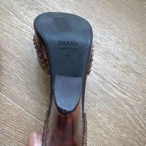 Very good condition, Prada leather and studded platforms. The heel is about 41/2 inches and beautifully patterned, as shown. The entire platform is in very good condition - the heels, the leather, studs, inside and bottom of both shoes. Original box with shoe bags.