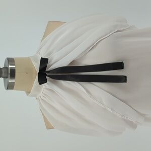 This elegant white chiffon top features a stylish black bow, perfect for any occasion. Its lightweight fabric ensures comfort and sophistication.