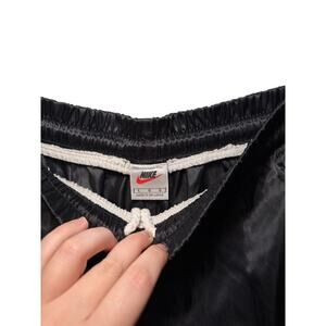Features a black satin-silky glanz fabric, black with white trim accents, iconic Nike Swoosh embroidered, elastic waistband with inner drawstring, mid-thigh length, small slit on each side for movability