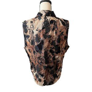 This unique tapestry vest combines timeless vintage charm with modern appeal. The intricate black floral pattern on a warm tan and brown background adds sophistication to any wardrobe, while its zip-front design and tailored fit provide stylish functionality. Elevate your outfit with this standout layering piece.