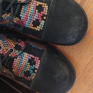Iron Fist black suede and rainbow sequin Sugar Skull boots in size 8. There is some wear to the suede on the toes and back of the heels. Only one small spot has a loose sequin.