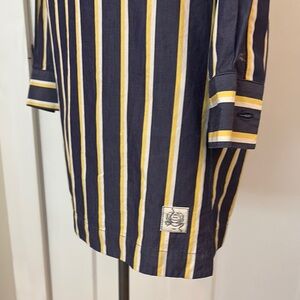 Size 36 European fits 4/6 in American! Shift pullover dress. Feels like a collared shirt material. SO WELL MADE! And all the Kitsuné accents :) Elegant women's dress featuring bold navy and yellow stripes. Perfect for any occasion with its stylish design and comfortable fit.
