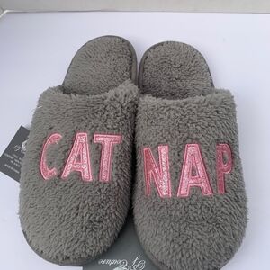 PJ COUTURE "Cat Nap" Grey Slippers Size M (7-8) and L (9-10). Adorable soft slippers that will keep your feet warm and cozy for those winter nights.