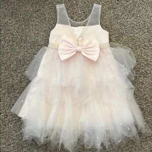 Charming pink dress with a layered tulle skirt. Features a beaded waistline for added elegance. Perfect for special occasions.
