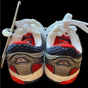 Stylish and comfortable, these New Balance kids' sneakers feature a sleek silver, navy blue, white & red design. Perfect for active play and everyday wear. Size 6 wide toddler. NWT; no box. Pet/ smoke free home.