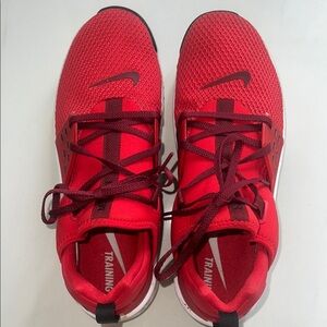 Vibrant red athletic shoes with black accents. Perfect for sports and casual wear. Size 10.5