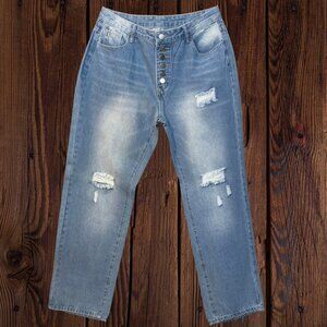 Stylish distressed denim shorts perfect for casual outings. Features a classic blue color and a trendy ripped design.