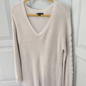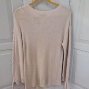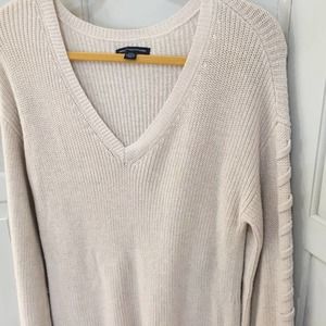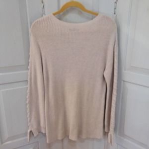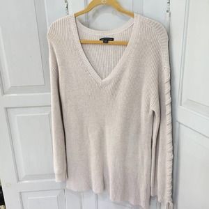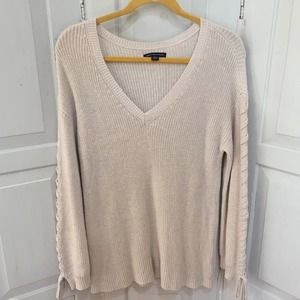American Eagle Outfitters oatmeal (light beige) pullover v-neck sweater with decorative lacing down each sleeve (last 2 pics).
