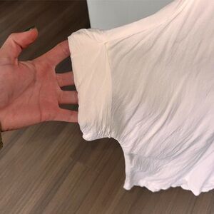 White lightweight short sleeved button up top with collar, two front pockets and cuffed sleeves.