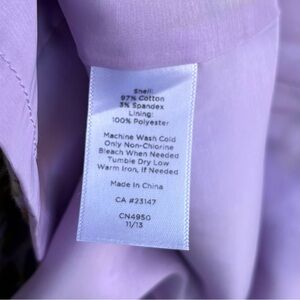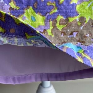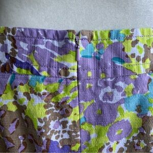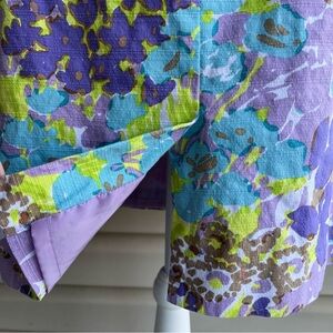 This is a gorgeous, lightly textured pencil skirt from Talbots in a purple and green abstract floral print - ladies size 6. It has a hidden back zipper with hook and eye closure, wide fixed waistband , kick pleat, and is fully lined. Shell is 97% cotton, 3% spandex (provides some stretch), and the lining is 100% polyester. This item is easy care machine was and dry. Perfectly polished!