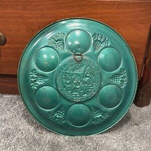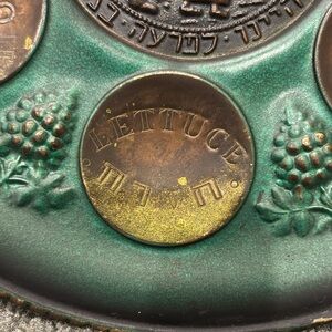 Beautiful vintage Seder plate with green and bronze tones. Features intricate designs and Hebrew inscriptions.