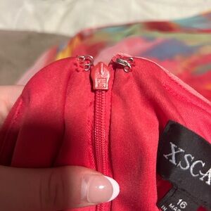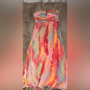Vibrant and stylish, this multicolor sleeveless maxi dress is perfect for any occasion. The bold colors make a statement, ensuring you stand out in any crowd. Beautiful for formals, proms, weddings, or any other formal event! Size 16 fits like a 12 or XL! I’m 5’9, 5’11 with heels like in picture and 38D in the picture and it fit perfectly!
