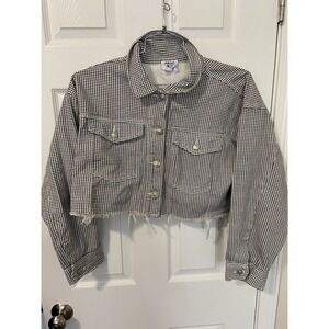 Princess Polly Denim Jacket Womens Sz 4 Crop Frayed Gray Houndstooth Cut Off