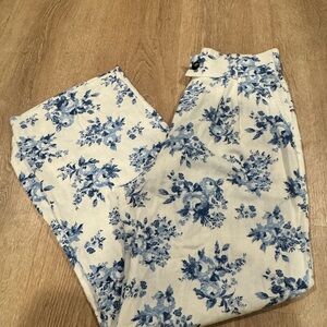 Stylish wide-leg pants with a blue floral print. Perfect for casual outings. Linen