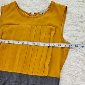 Stylish sleeveless dress. Mustard yellow top with pleated design. Gray skirt with a classic fit. Perfect for work or casual outings.