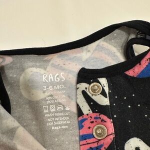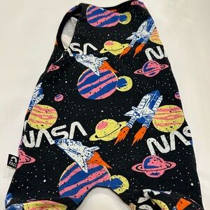 Adorable baby romper with a NASA space theme. Features colorful planets and rockets on a black background.
