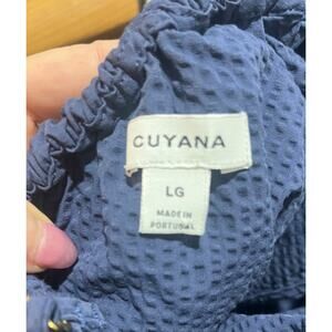 The Cuyana One Shoulder 100% Cotton Seersucker Navy Dress in Size L is a stylish, minimalist piece known for its modern asymmetrical design, lightweight, and high-quality fabric. Here's a detailed description: