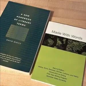 ✨ Set of two books: 'A New Handbook of Literary Terms' by David Mikics and 'Made With Words' second edition by Isaacs, Giura, Keohane, Kitchen, Lubrano, and Maloy. Perfect for literature and writing enthusiasts, used in college, both in great condition. A New Handbook of literary terms has no writing or highlight. The made with words, has only one portion that is highlighted which is pictured, but also in good condition.