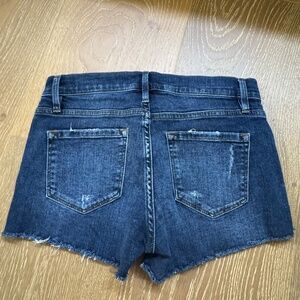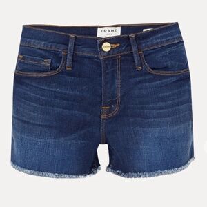 FRAME Le Cutoff frayed denim shorts. Button and concealed zip front. Made from denim with a hint of stretch, this pair has frayed hems. Easy to dress up or down and a nice staple for summer or warm months. Very good condition.