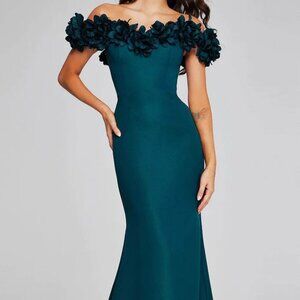 Enjoy a memorable evening with this masterwork by Daymor, Alexander, 1991S24. The dress has a magnificent and sophisticated charm thanks to the 3D floral appliques and bead details on the cap sleeves. Princess seams are utilized to highlight your curves and shape it. Its striking features include a straight off-the-shoulder neckline and a mid-open shape at the back.