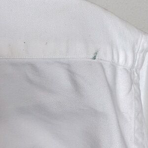 Size M. 100% cotton. This item has been dry cleaned and is in very good condition. However, there is a very small stain at the top of the right shoulder. See photo.